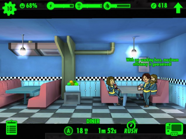 If you are running low on resources, or you are just impatient, you can always attempt to “rush” their production. When you make this attempt you get a view of the risk vs the reward. The reward is a slight bump in production for that round, a few caps and some XP for the dwellers involved. Failing is calculated as the perchance chance of an “Incident” occurring, which manifests itself in the room catching on fire, or radroaches bursting out of the floor and thoroughly fucking everyone up.