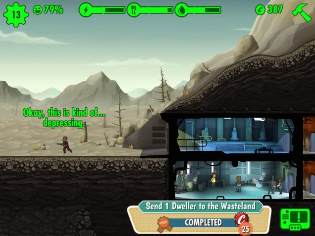 All new rooms and upgrades require caps, which are earned in a few ways. Each time a Dweller levels up they throw a few caps your way, rushing production rewards caps as well. The easiest way to keep the caps flowing in is to complete the daily challenges, which can involve anything as simple as arming a dweller or collecting X amount of resources, to something insane like putting out 12 fires or having 8 babies. Each successful completion will award caps and then be replaced with a new challenge.